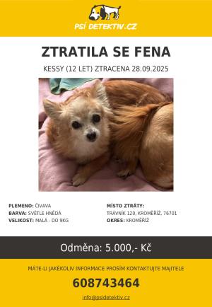 Kessynka je 12 let stará fenka čivavy s delší srstí. Obojek nemá, je čipovaná i kastrovaná a váží cca 4 kg.