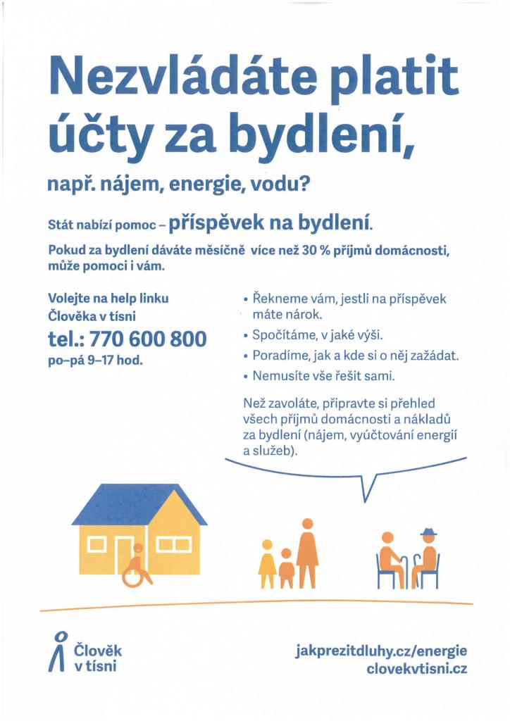Nezvládáte platit účty za bydlení, např.nájem, energie, vodu? Stát nabízí pomoc-příspěvek na bydlení. Pokud za bydlení dáváte měsíčně více než 30% příjmů domácnosti, může pomoci i vám. Volejte na help linku Člověka v tísni tel.:770 600 800 po-pá 9,00-17,00 hod.