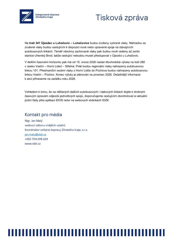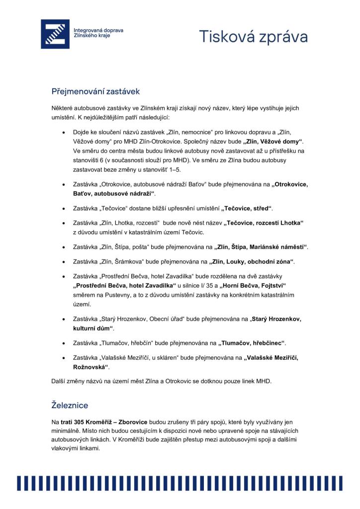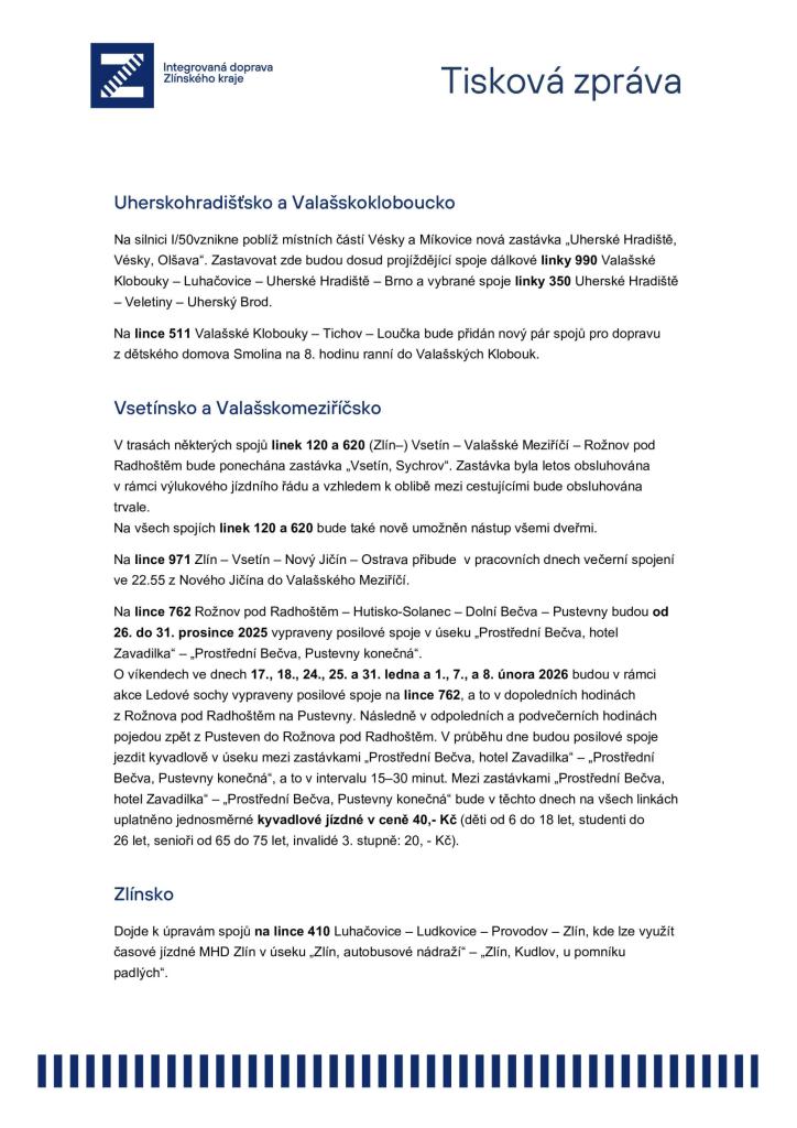 Změny v jízdních řádech integrované dopravy Zlínského kraje, k nimž dojde od neděle 14. prosince 2025.