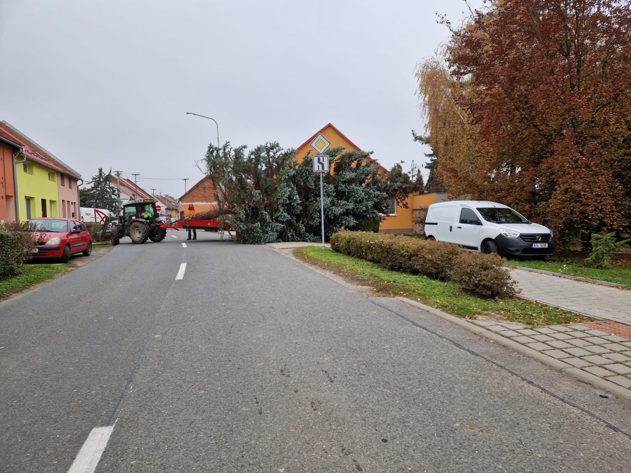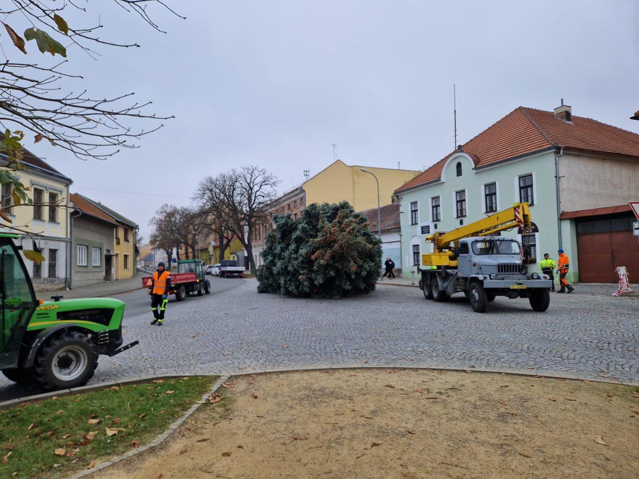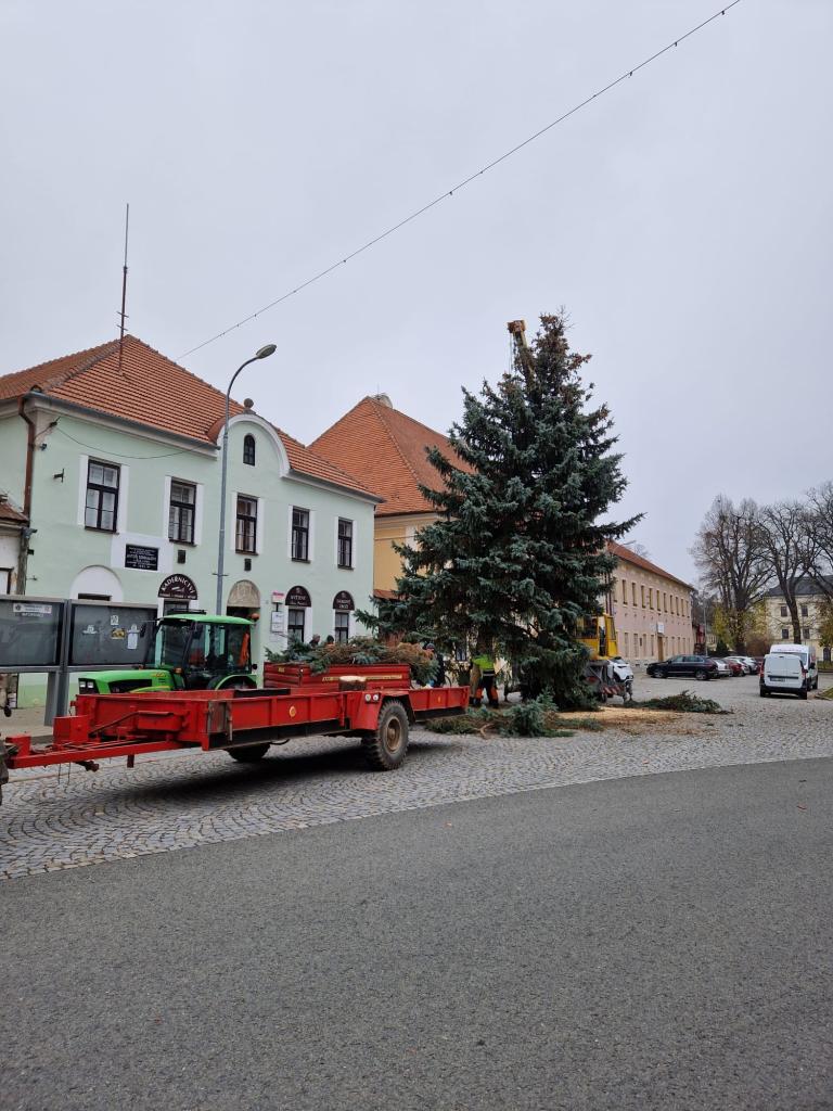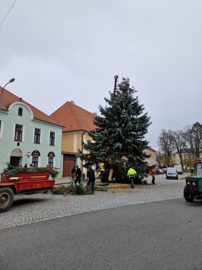 Stavění vánočního stromečku. Obec děkuje dárcům stromu, manželům Loučkovým z Bělovské ulice.