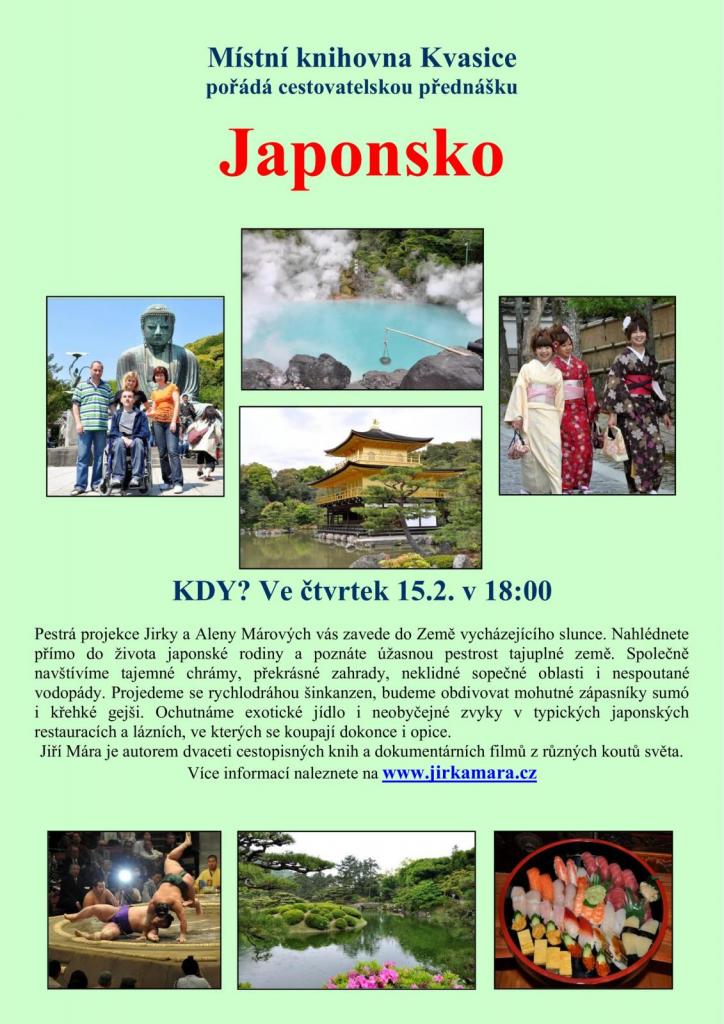 Místní knihovna Kvasice pořádá cestovatelskou besedu Jirky a Aleny Márových věnovanou vzdálenému Japonsku, která se bude konat ve čtvrtek 15.2.2024 v 18,00 hodin v zeleném salónku Sokolovny Kvasice.