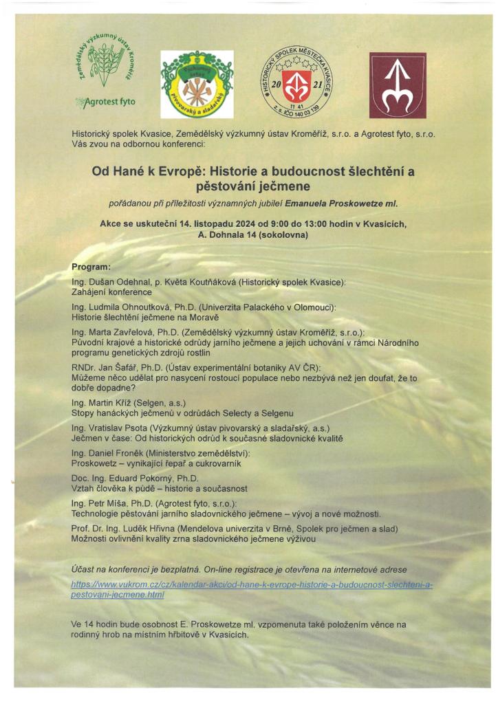 Historický spolek Kvasice a Zemědělský výzkumný ústav Kroměříž, s.r.o. pořádají při příležitosti významných jubileí Emanuela Proskowetze ml. odbornou konferenci „Od Hané k Evropě: Historie a budoucnost šlechtění a pěstování ječmene“. Akce se uskuteční 14. listopadu 2024 v Kvasicích, přednášet budou mj. odborníci z Mendelovy univerzity v Brně, Univerzity Palackého v Olomouci, Ústavu experimentální botaniky, Výzkumného ústavu pivovarského a sladařského a Zemědělského výzkumného ústavu Kroměříž.