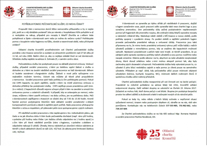 Jsme registrovanou sociální službou s více než 20tiletou historií a zkušenostmi v oblasti pečování. Proto svou pozornost zaměřujeme i na pečující členy domácnosti pořádáním setkání svépomocné skupiny. Naší podstatnou předností je také návaznost na další sociální a zdravotní služby, poskytované Oblastní charitou Kroměříž. To vše, spolu se zaměřením na duchovní potřeby, se výrazně podílí na komplexnosti poskytované péče.